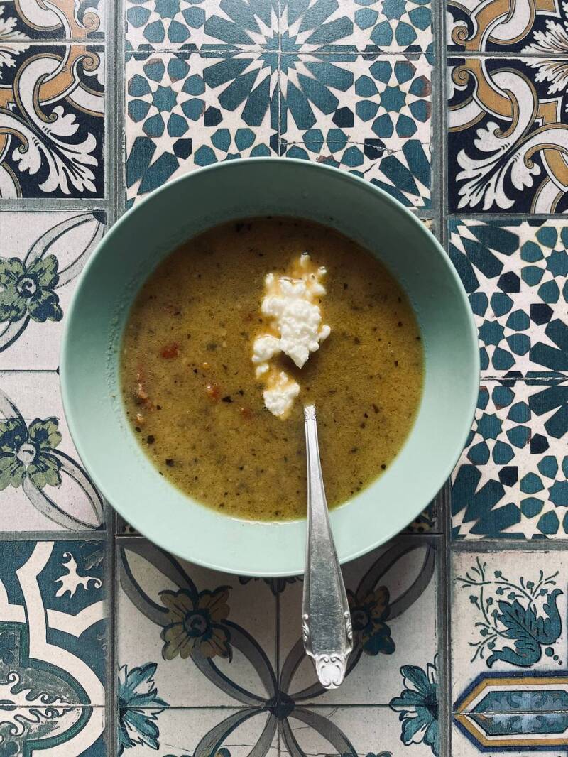 - Serveer de soep niet te heet, voeg per persoon een theelepel magnesium toe, roer door en voeg daarna een eetlepel cottage cheese toe.